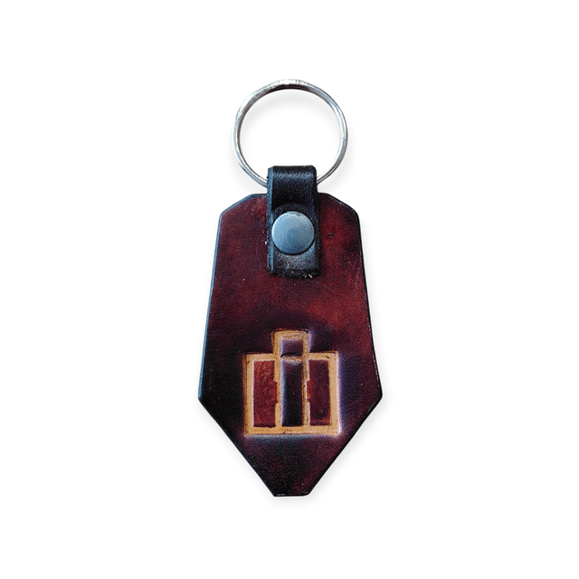 Porte clé en cuir, avec un motif embossé au centre.