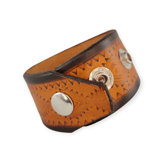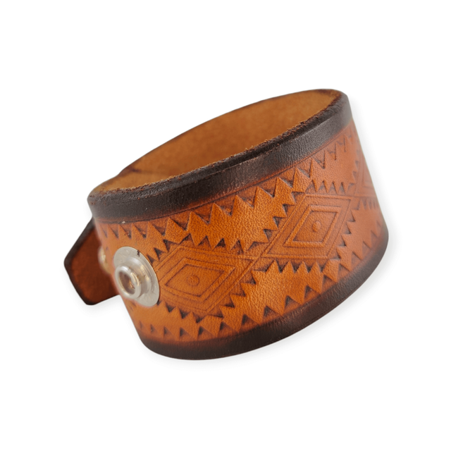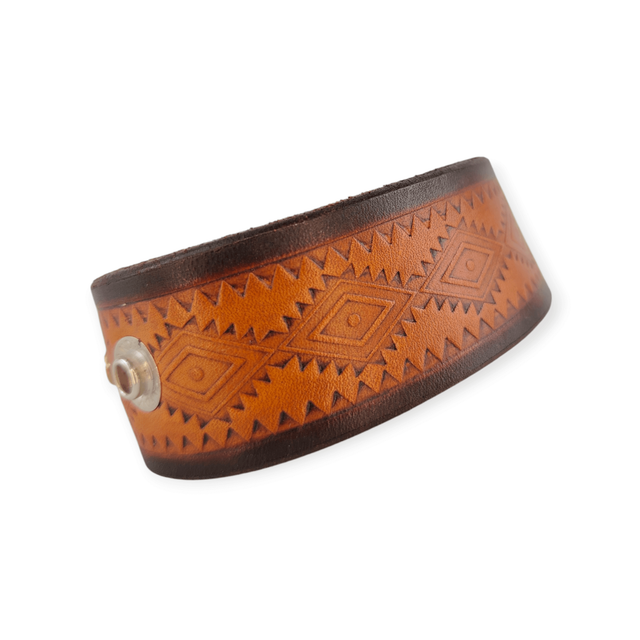 Bracelet en cuir de teinte marron clair, avec les bords plus foncés. Motif de losanges imbriqués. Se ferme par boutons pressions (15 et 16 cms et 18 cms)