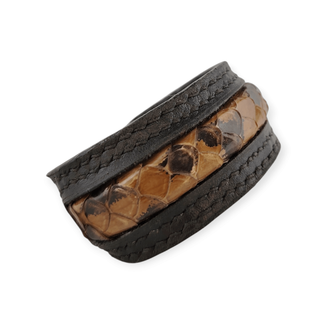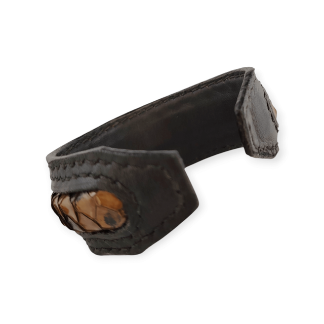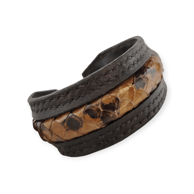 La partie centrale de ce bracelet est en cuir de poisson de couleur beige avec des taches noires. Ce bracelet est entièrement doublé en cuir noir, il recouvre un jonc métallique. Réglable, il s’ajuste à la taille du poignet par simple serrage avec votre main. Sans fermoir.