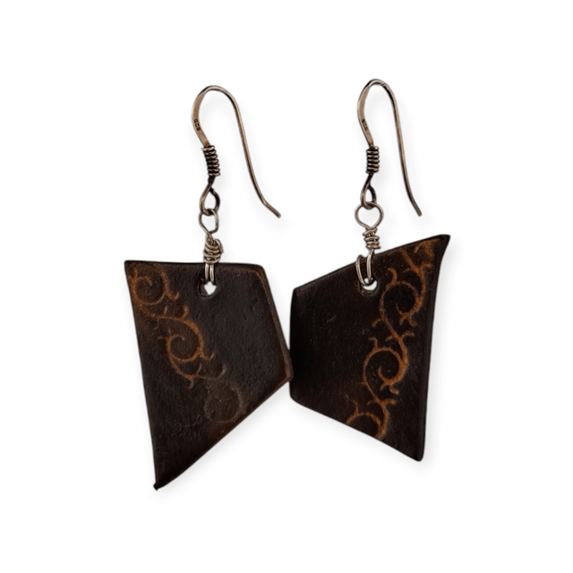 Sur une forme de trapèze, une frise stylisée est embossée. La teinte différente pour la frise la fait ressortir sur le fond marron foncé.