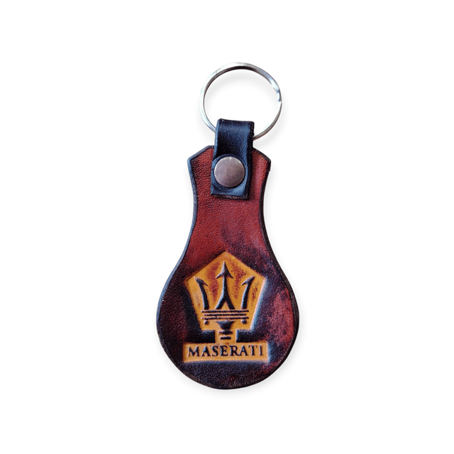 Porte clé en cuir, avec un motif embossé au centre.