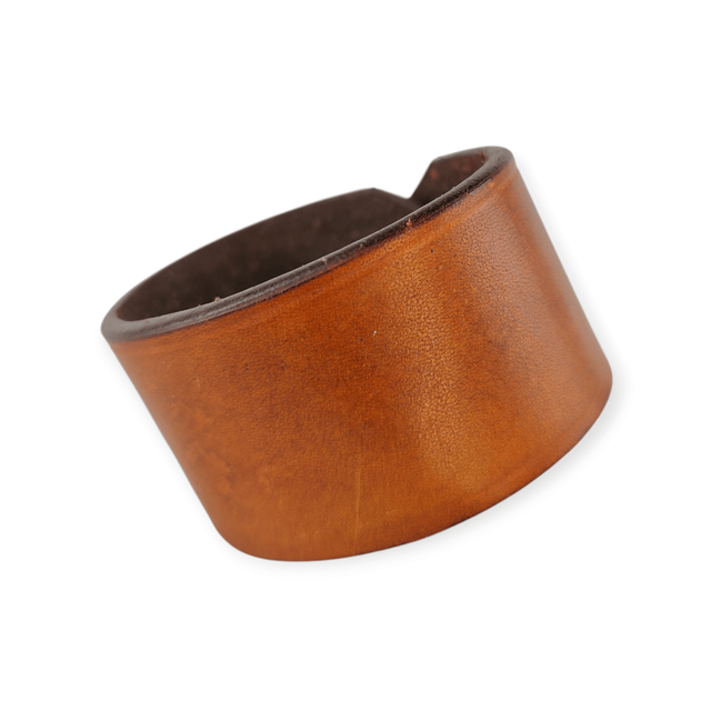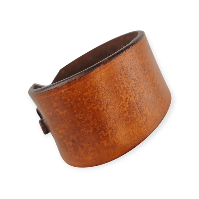 Bracelet en cuir de couleur marron, comportant une partie de martelée pour un effet mousse. Se ferme par boutons pressions (2 emplacements, 14.5 et 16.5 cms)