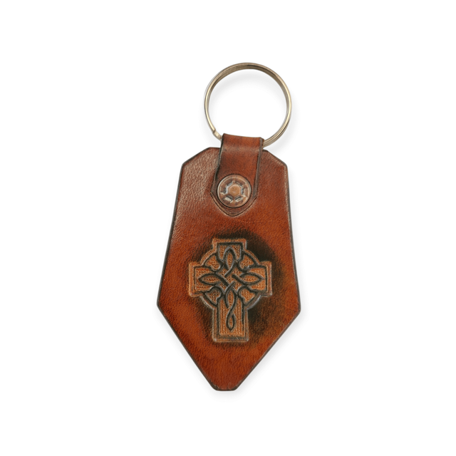 Porte clé en cuir, avec un motif embossé au centre.