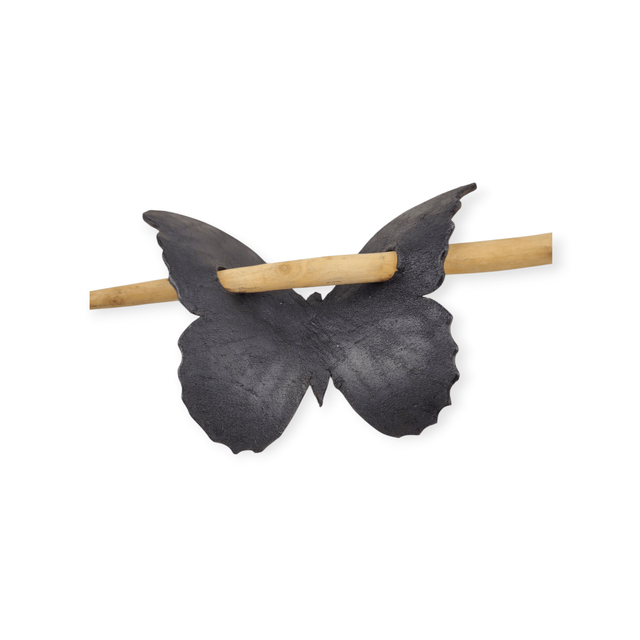 Apportez une touche d’élégance naturelle à votre coiffure avec ce pic à cheveux unique. La baguette est taillée dans une branche d’arbre. Elle s’accompagne d’une pièce en en cuir représentant un papillon, sculpté et peint à la main.