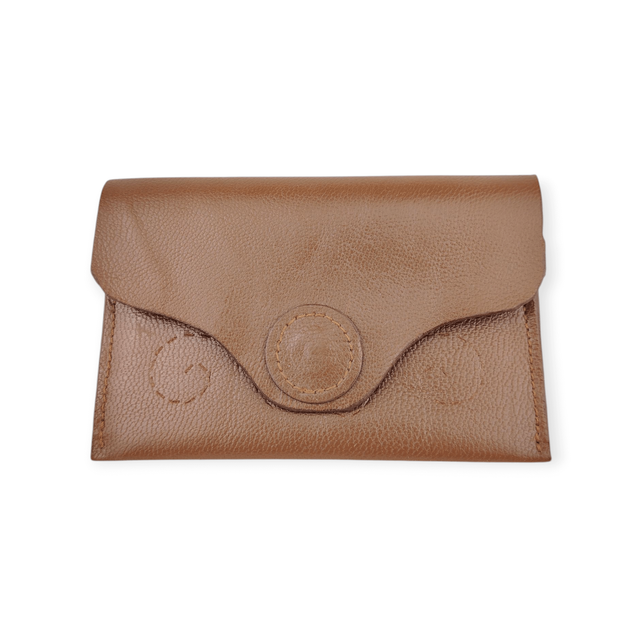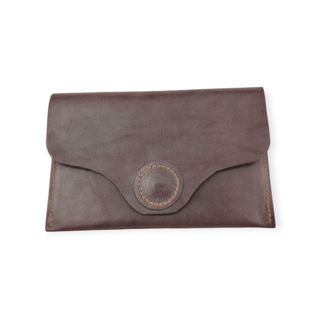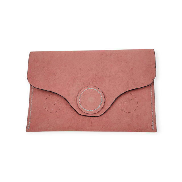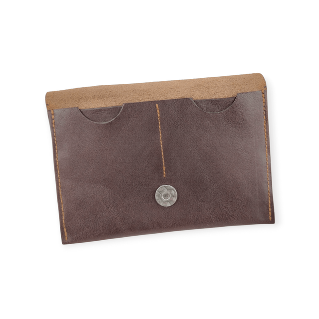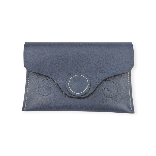 En cuir, cousu avec ma Singer de 1927, elle se ferme par une pression magnétique. Compacte mais suffisamment grande pour pouvoir la trouver au fond du sac ou de la boîte à gants.