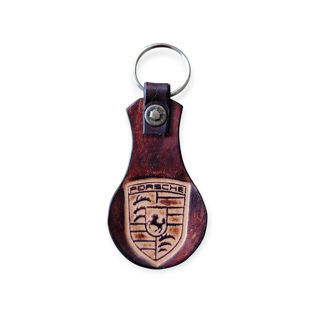 Porte clé en cuir, avec un motif embossé au centre.