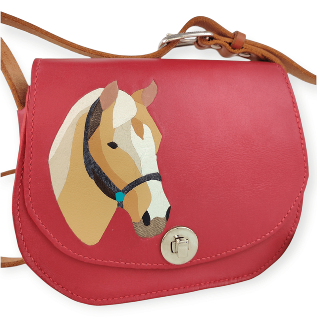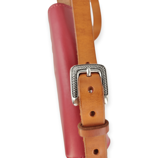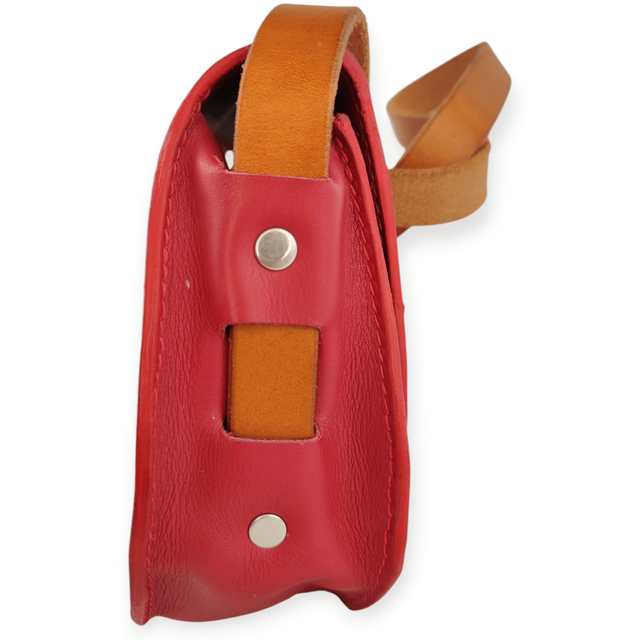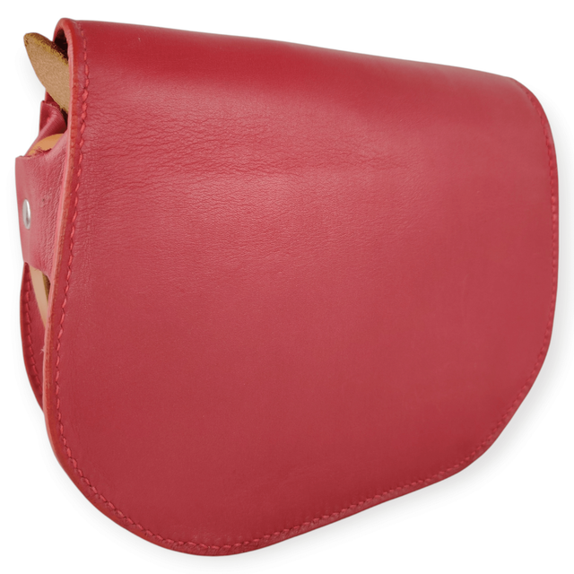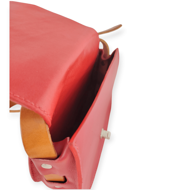 Cuir rouge framboise lisse et souple. Sangle en cuir couleur cognac. L’intérieur du sac est doublé pour plus de tenue. Pieds de sac sur le fond.