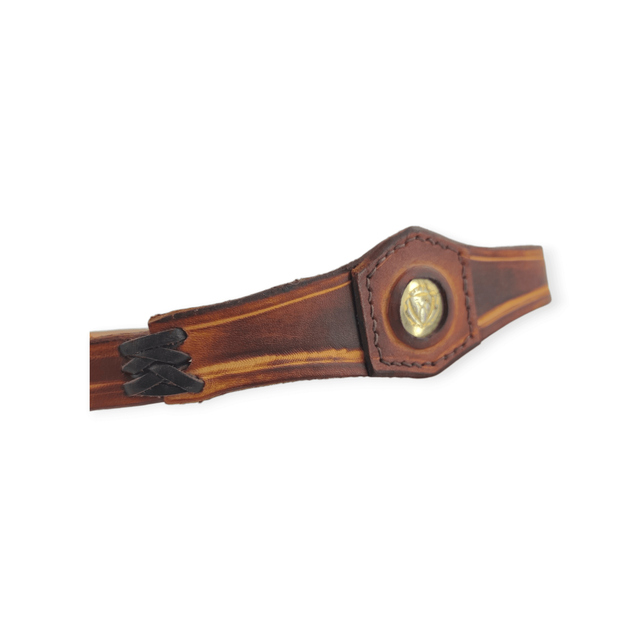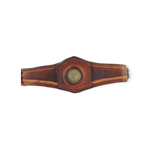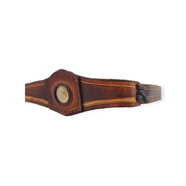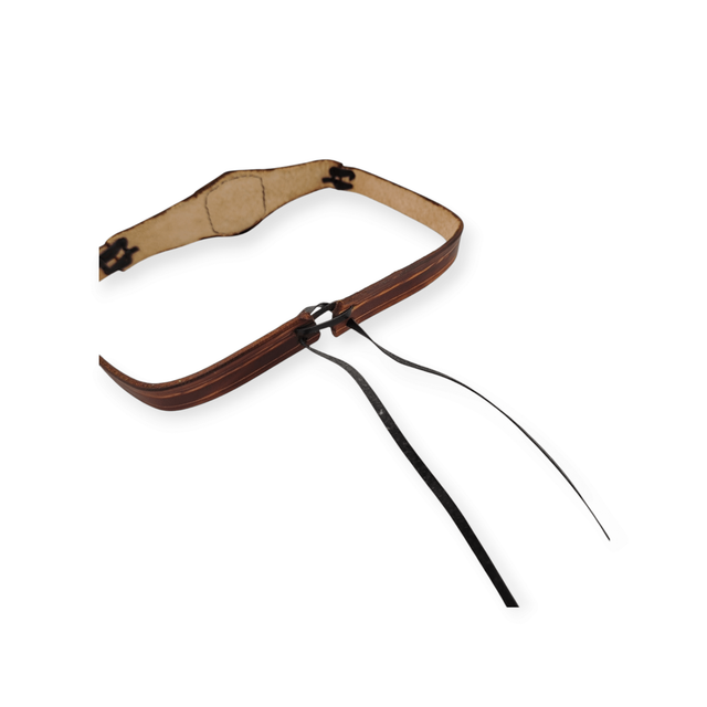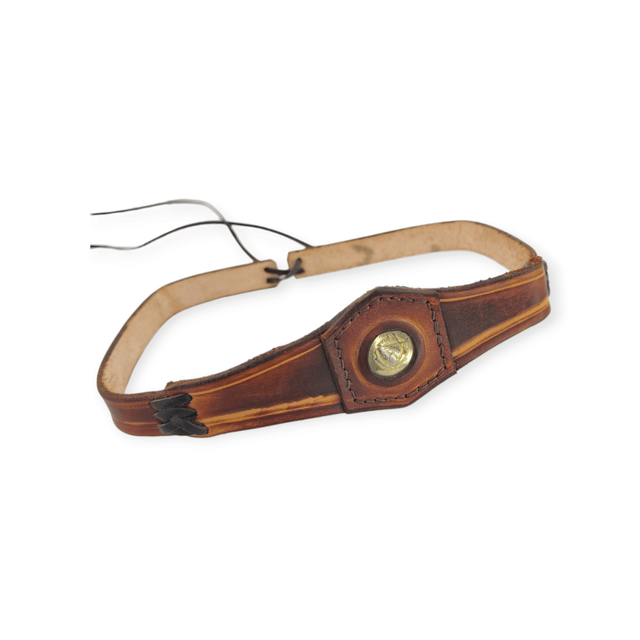 Tiare forme triangle au centre, avec une pièce incrustée représentant un blason. De couleur marron, elle comporte deux laçages en cuir qui se positionnent sur les tempes.