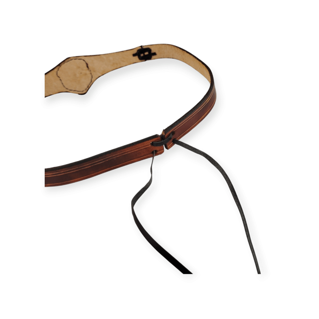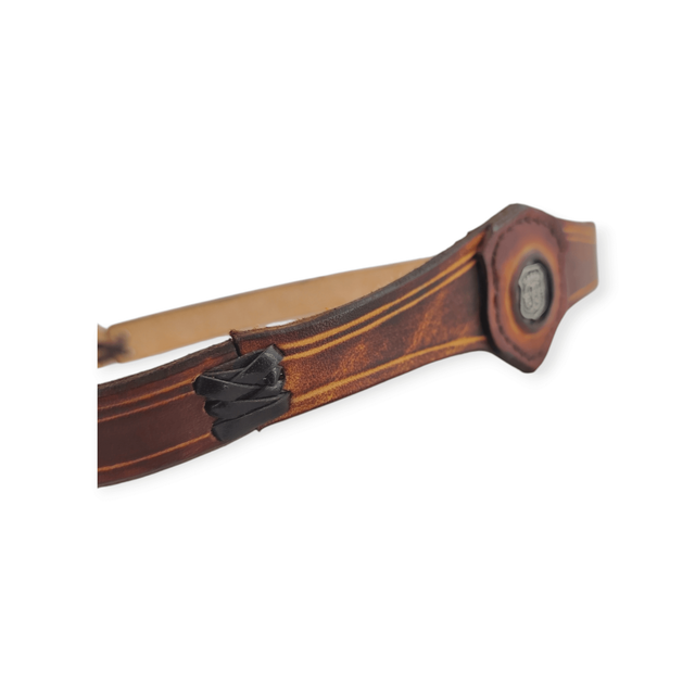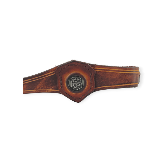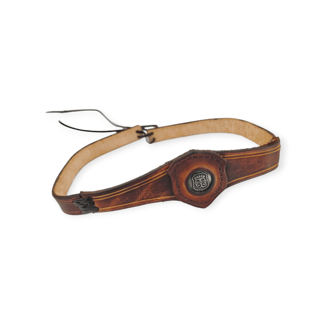 Tiare forme triangle au centre, avec une pièce incrustée au centre. Un blason couronné est gravé, couleur argent. De couleur marron, elle comporte deux laçages en cuir qui se positionnent sur les tempes.