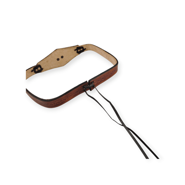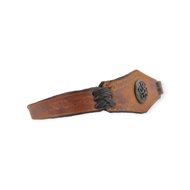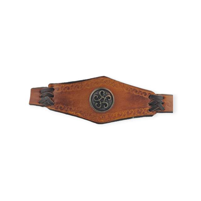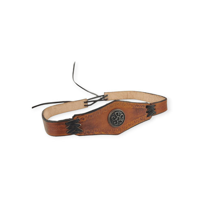 Tiare forme triangulaire au centre, avec une pièce rivetée au centre. Spirale à 6 bras de couleur laiton. De couleur marron clair, elle comporte deux laçages en cuir qui se positionnent sur l’avant de la tête.