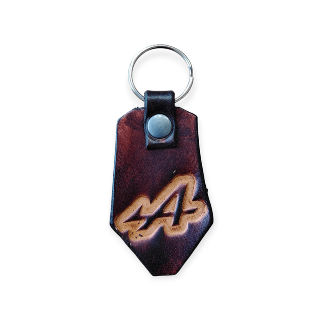 Porte clé en cuir, avec un motif embossé au centre.